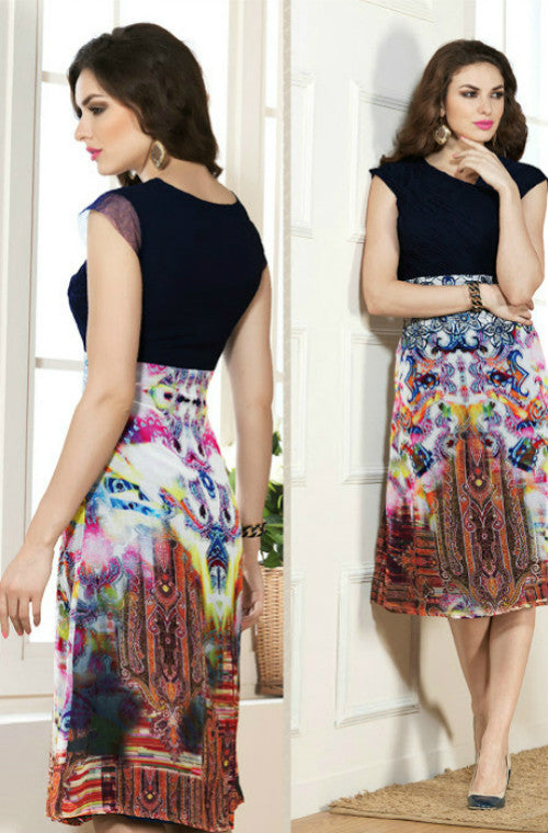 This multicolored kurti in faux georgette features a contemporary digital printed pattern on the bottom and an attached navy blue top. Available as stitched (ready-to-wear).