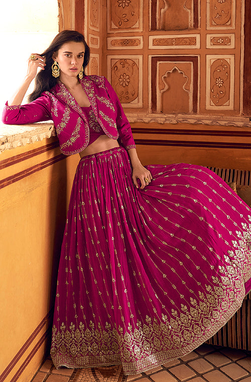 Magenta Designer Embroidered Party Wear Jacket Style Chinon Lehenga