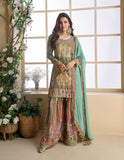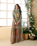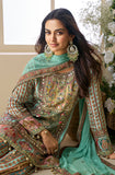 Mint Green Beige Designer Embroidered Pure Crepe Silk Party Wear Gharara Suit