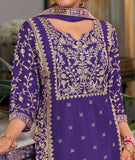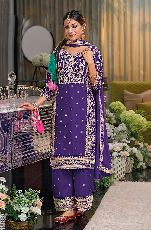 Purple Designer Embroidered Chinon Silk Party Wear Palazzo Suit
