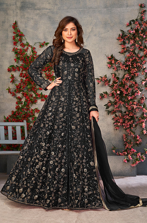 Black Designer Heavy Embroidered Net Party Wear Anarkali Gown