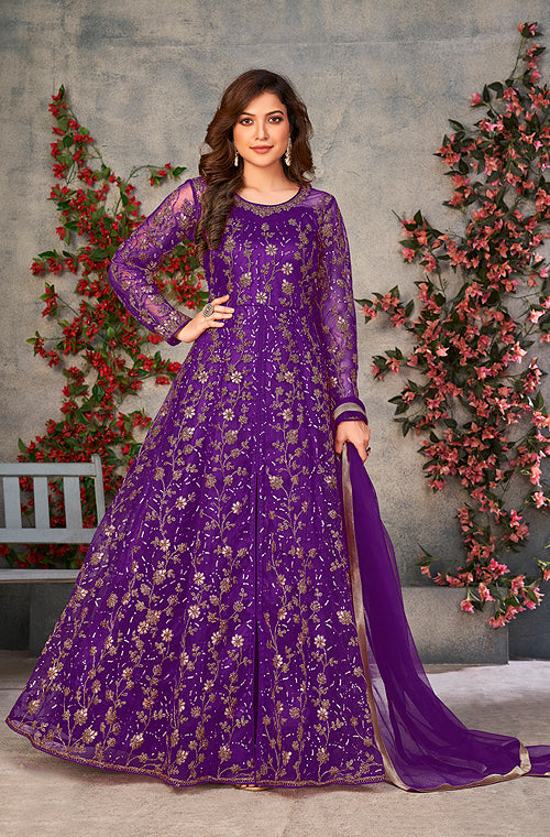 Purple Designer Heavy Embroidered Net Party Wear Anarkali Gown