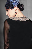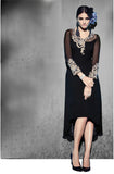 This stylish and glamorous designer georgette kurti in a black shade has a beautiful floral embroidered pattern on the neckline all the way to the back. To make it even more pretty, the dress has an uneven hem and matching embroidered cuffs. Pair this gorgeous indo-western kurti with flats for a casual feel or pumps for a classy, refined look. Available as stitched (ready-to-wear).