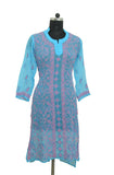 The blue kurti made in finest quality georgette is adorned with beautiful chikankari hand embroidery all over the front with elegant motifs on the back. Available as stitched (ready-to-wear).