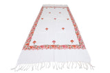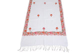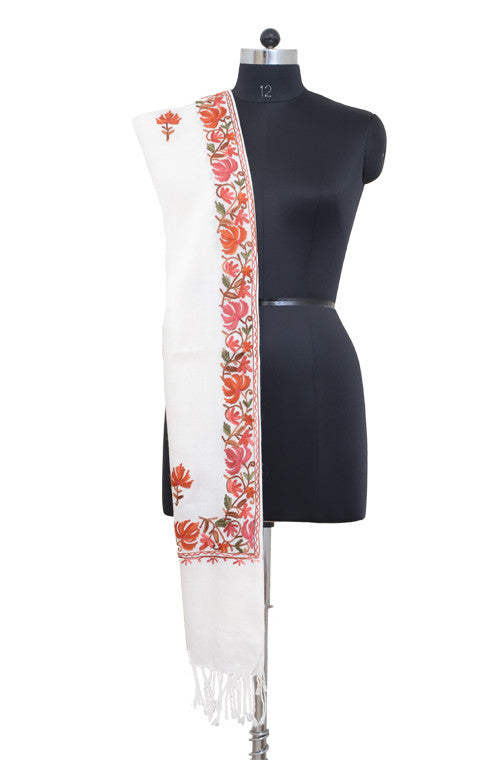 The gorgeous white pure pashmina shawl is 100% authentic and is hand embroidered with stunning multicolored aari work. All our shawls/stoles are made from a blend of 90% finest pashmina (cashmere) wool & 10% silk, exclusively hand spun and hand woven by craftsmen in Kashmir. With a Standard 2-Ply thickness, this lovely shawl can be worn as a warm scarf in chilly weather or can be wrapped around even in warm outdoors.