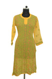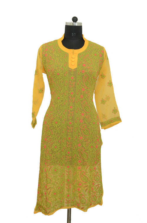 The long yellow kurti made in finest quality georgette is adorned with beautiful green chikankari hand embroidery all over the front with elegant motifs on the back. Available as stitched (ready-to-wear).
