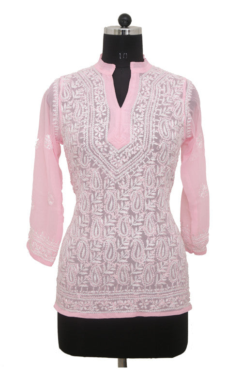 The light pink top made in finest quality georgette is adorned with beautiful chikankari hand embroidery all over the front with elegant motifs on the back. Available as stitched (ready-to-wear).