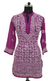The purple short kurti made in finest quality georgette is adorned with beautiful chikankari hand embroidery all over the front with elegant motifs on the back. Available as stitched (ready-to-wear).