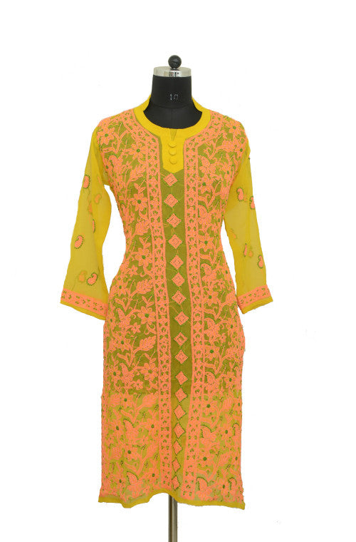 The coral pink & yellow long kurti made in finest quality georgette is adorned with elegant chikankari hand embroidery all over the front with elegant motifs on the back. Available as stitched (ready-to-wear).