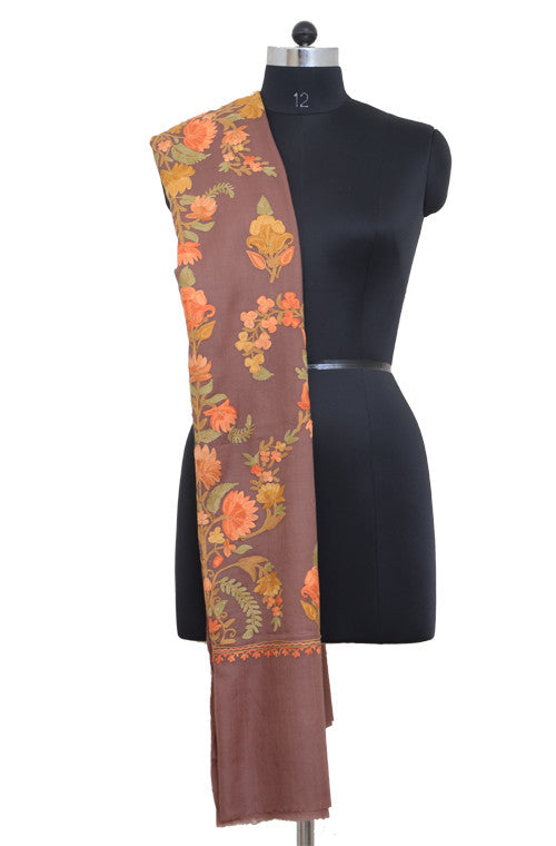 This elegant deep purple colored pure pashmina shawl is 100% authentic and is hand embroidered with stunning aari work. All our shawls/stoles are made from a blend of 90% finest pashmina (cashmere) wool & 10% silk, exclusively hand spun and hand woven by craftsmen in Kashmir. With a Standard 2-Ply thickness, this lovely shawl can be worn as a warm scarf in chilly weather or can be wrapped around even in warm outdoors.