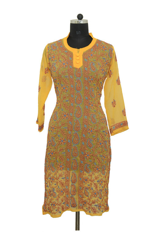 The yellow kurti made in finest quality georgette is adorned with beautiful brown colored chikankari hand embroidery all over the front with elegant motifs on the back. Available as stitched (ready-to-wear).