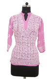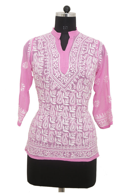 The pink top made in finest quality georgette is adorned with beautiful chikankari hand embroidery all over the front with elegant motifs on the back. Available as stitched (ready-to-wear).