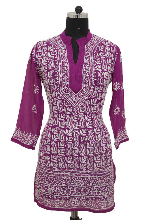 The purple short kurti made in finest quality georgette is adorned with beautiful chikankari hand embroidery all over the front with elegant motifs on the back. Available as stitched (ready-to-wear).