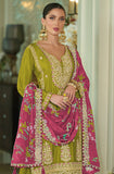 Olive Green & Magenta Designer Embroidered Chinon Silk Wedding Sharara Suit