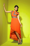This beautiful orange asymmetric faux georgette kurti is adorned with black embroidered patterns on the yoke, and is lined with santoon, ideal for day and night wear. Available as stitched (ready-to-wear).