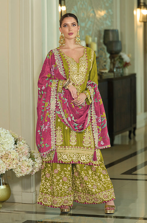 Olive Green & Magenta Designer Embroidered Chinon Silk Wedding Sharara Suit